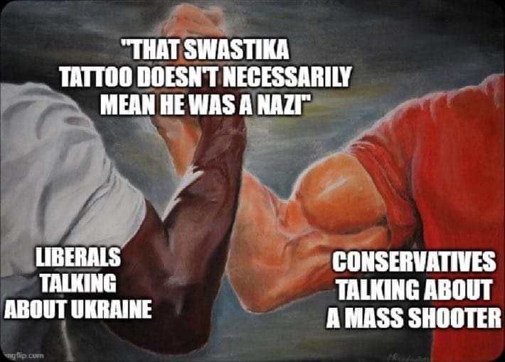 the handshake meme, on one side liberals talking about Ukraine. on the other, conservatives talking about a mass shooter. the handshake “that swastika tattoo doesn’t necessarily mean he was a Nazi”