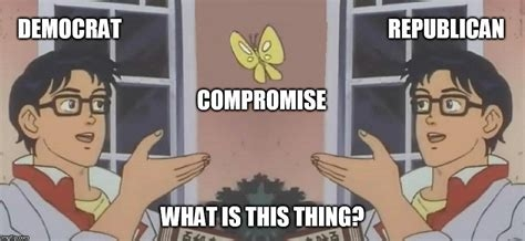 A Republicans on one side and a Democrat on the other, gesturing toward the butterfly between them labeled “compromise” with caption of them saying “What is this thing?”