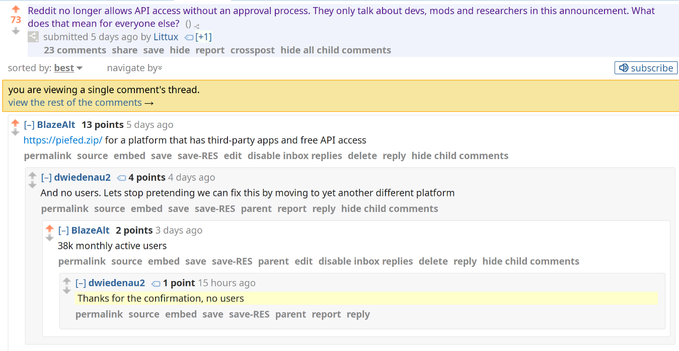 It’s okay, if Reddit is what “has users” looks like, then I’m perfectly happy to have “no users” over here on the Fediverse.
