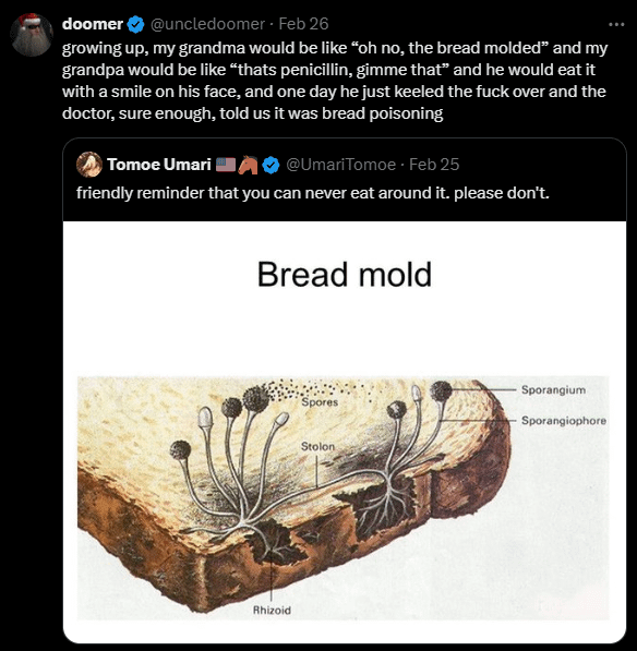 minus-squarePrimeMinisterKeyes@leminal.spacelinkfedilinkEnglisharrow-up71·5 hours agoReminder that, per Wikipedia, aflatoxins - the poisons in molds - “are among the most carcinogenic substances known.” Furthermore, aflatoxin B1 can permeate through the skin and its LD50 can be as low as 300 µg/kg.