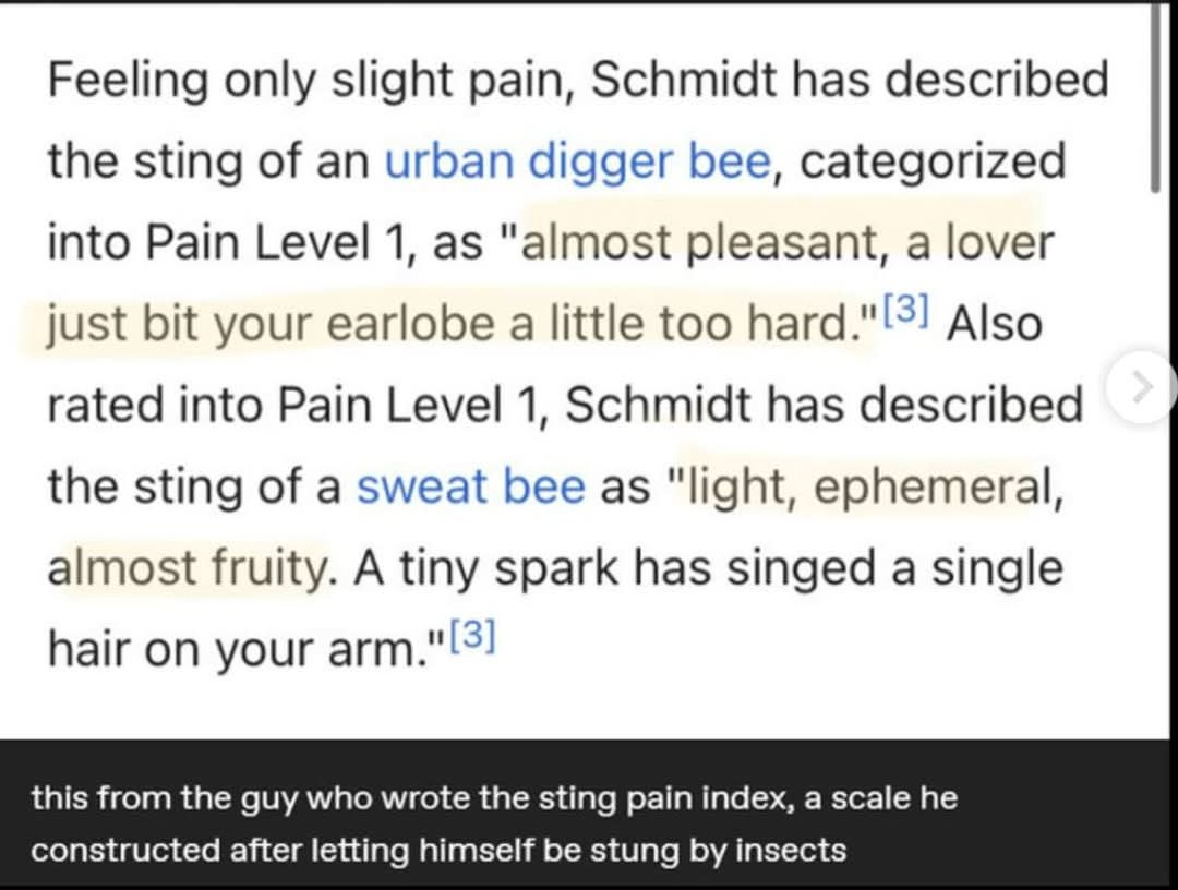 minus-squareDenjin@feddit.uklinkfedilinkEnglisharrow-up1·11 days agoSchmidt’s index is full of brilliant stuff. Red Fire Ant: Sharp, sudden, mildly alarming. Like walking across a shag carpet and reaching for the light switch. Tropical Fire Ant: You should have learned, but the carpet is the same, and when you again reach for the light switch, the shock mocks you. Southern Fire Ant: It happens on the third day, as you reach for the light switch, and you’re wondering when you will ever learn. Giant Ant: A pulsing sting with some flavour. You stepped into a salt bath with an open wound. Glorious Velvet Ant: Instantaneous, like the surprise of being stabbed. Is this what shrapnel feels like? Warrior Wasp: Torture. You are chained in the flow of an active volcano. Why did I start this list? Tarrantula Hawk Wasp: Blinding, fierce, shockingly electric. A running hair dryer has just been dropped into your bubble bath. Absolute lunatic.