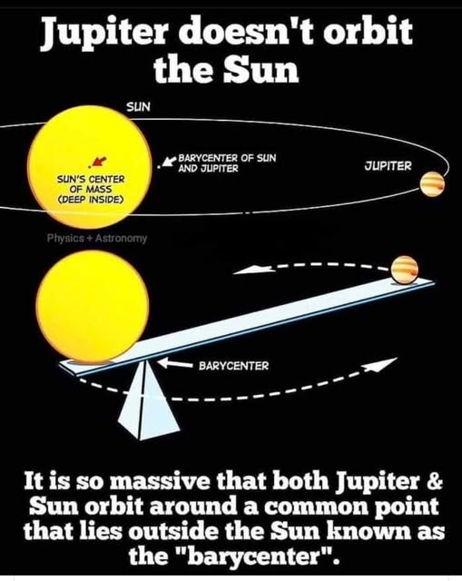 The way this is phrased makes it sound like there’s a certain threshold where this starts happening. That’s not right. Even a grain of dust wouldn’t orbit the sun, they still orbit their common barycenter. A less misleading way of phrasing would be that Jupiter is massive enough that the barycenter of it and the sun actually lies outside the sun, which is still a cool fun fact.