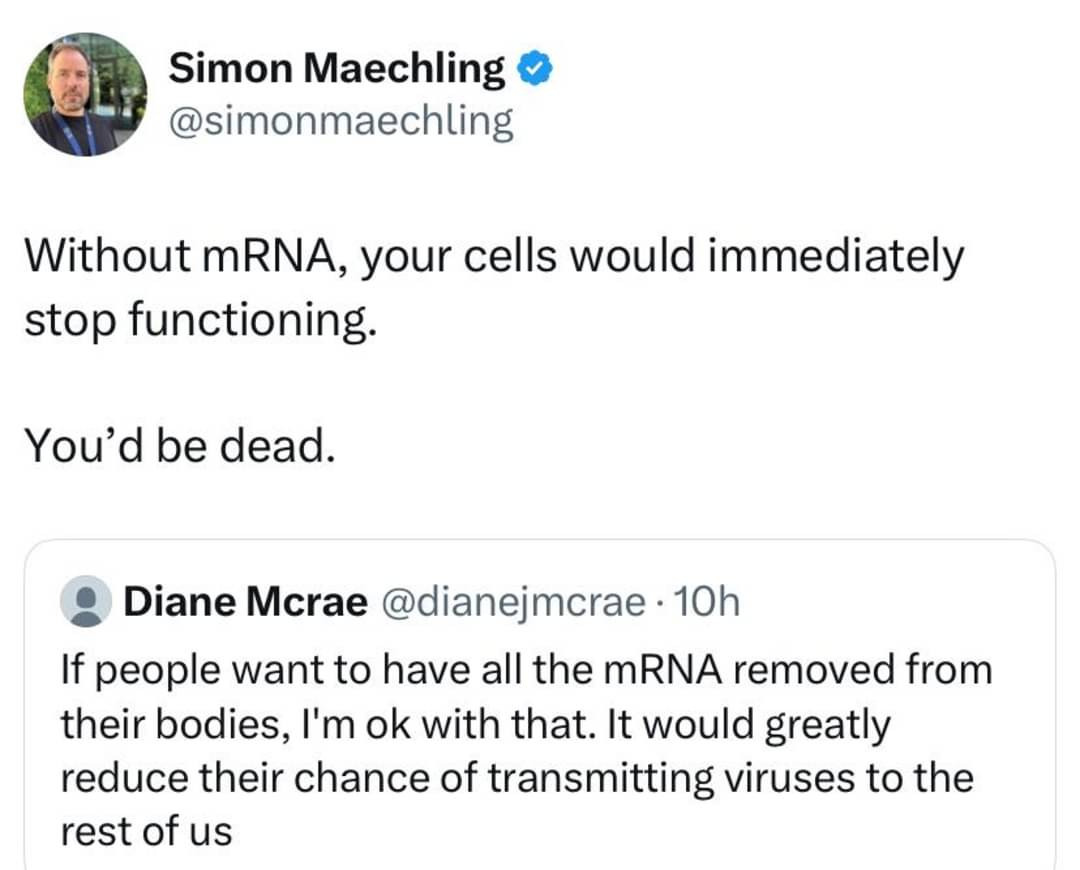 On the other hand, deleting DNA (and thus preventing the creation of RNA) cannot be survived. A great exploration of such scenario is in the No More DNA chapter in What If? by Randall Munroe: the syptoms would be like eating an Amanita mushroom such as the “Destroying Angel”, whose amatoxin prevents DNA transcription, or acute gamma irradiation. The patient is fine for a few hours (or less with a theoretical DNA wipe), then start exhibiting cholera-like symptoms (vomiting, abdominal pain, diarrhea), then they start to feel better. However, at that point, since cells can’t divide, immune system collapse or systemwide organ failure is inevitable.