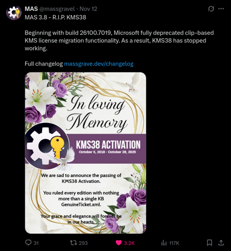 mr_MADAFAKA@lemmy.ml to Piracy: ꜱᴀɪʟ ᴛʜᴇ ʜɪɢʜ ꜱᴇᴀꜱ@lemmy.dbzer0.comEnglish · 28 days agoMicrosoft has blocked Massgrave's KMS38 activation method for Windowsplus-squarelemmy.mlimagemessage-square3linkfedilinkarrow-up13arrow-down10
